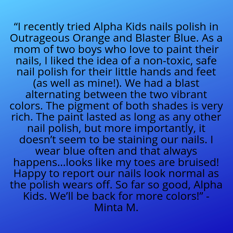 The Alpha Kid’s polishes are 10-Free, Vegan, & Cruelty-Free. Our polishes are not harmful or toxic. They are handcrafted in small batches & made in the USA. Our colors are bright, bold, & fast drying. The Alpha Kid’s polishes do not require base coats, top coats, or multiple coats, so your kids can get back to playing faster!